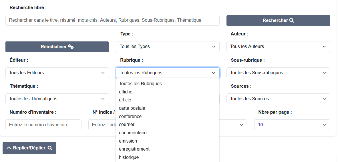 Chaque type de document est présenté sous forme de lien, permettant d’effectuer une recherche ou un filtrage ciblé sur ce type. A savoir que chaque filtre a sa liste (exemple : liste des Auteurs, des Editeurs, Rubriques, Sous-Rubriques, Thématiques, Parcours, Sources, Collections .....), ces listes sont générees automatiquement depuis le contenu du fichier XML.